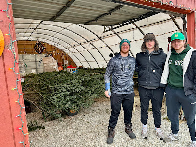 ... be the Advent season without a Christmas tree. So, with the help of dedicated freshmen residents, Liam Verrier and Michael Heffernan, and a RA, Christian Bardsley, the Hall's Christmas tree made its arrival. In short order, the comely tree took up residence in the Gregorian Lounge, just fitting, adding its beautiful pine fragrance to a room that could use a bit of aromatic assistance. Decorating and naming of the tree will happen later this week, and so there's more to come. On the Christmas tree's arrival, Fr. Ralph said, "In the words of Clark Griswald's Dad in the movie Christmas Vacation, 'She's a beaut Clark!'"